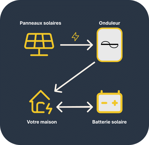 Ce schéma illustre une installation centralisée via un onduleur hybride. Celui-ci gère intelligemment les flux : il alimente la maison en direct et dirige le surplus vers la batterie pour une utilisation ultérieure, optimisant ainsi l’autoconsommation.